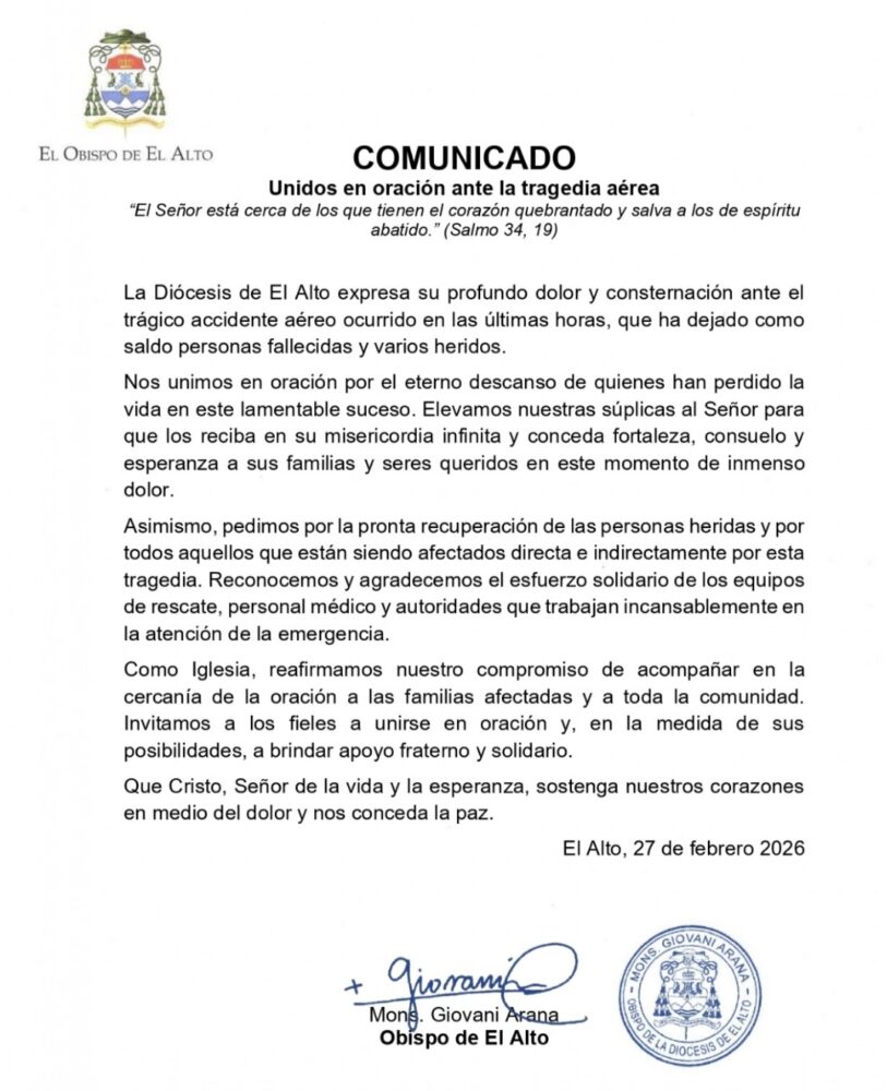 La Diócesis de El Alto emitió un comunicado oficial luego del accidente aéreo ocurrido en las últimas horas, que dejó víctimas fatales y varios heridos.