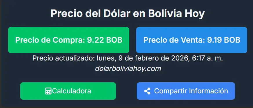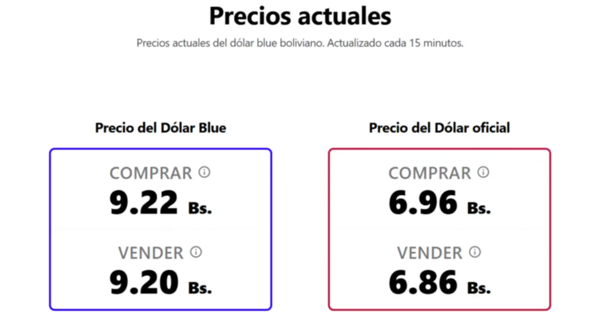 Por su parte, el portal bolivianblue.net, que actualiza sus cifras cada 15 minutos, reporta una cotización de Bs 9,22 para la compra y Bs 9,20 para la venta. La noche anterior, ese sitio había cerrado con Bs 9,21 para la compra y Bs 9,19 para la venta.