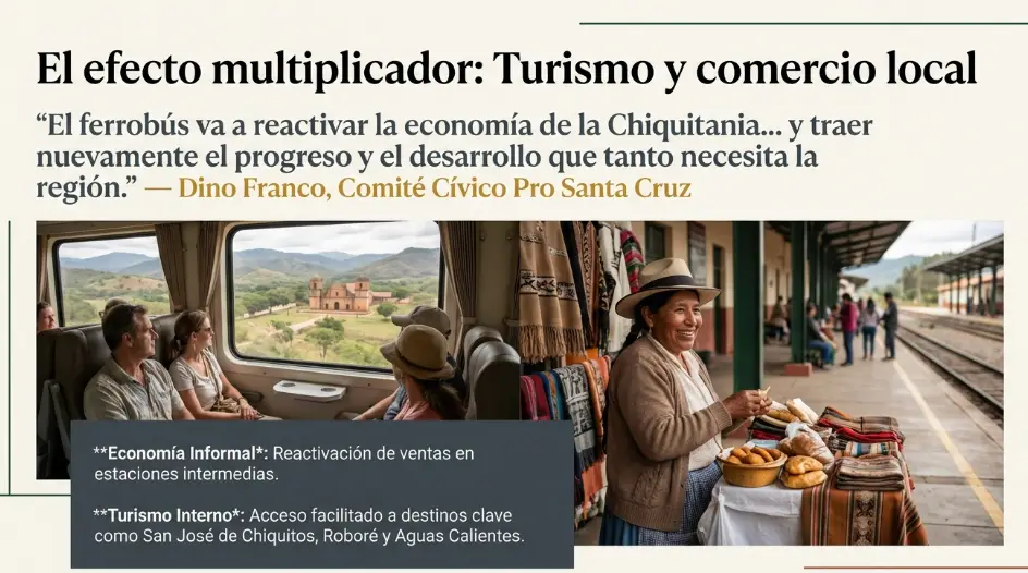 Según Franco, el beneficio no se limitará al transporte de pasajeros, sino que alcanzará al comercio local y a la economía informal, ya que el servicio contempla paradas en estaciones intermedias como Cotoca, Pailón, San José de Chiquitos y Roboré, entre otras.
