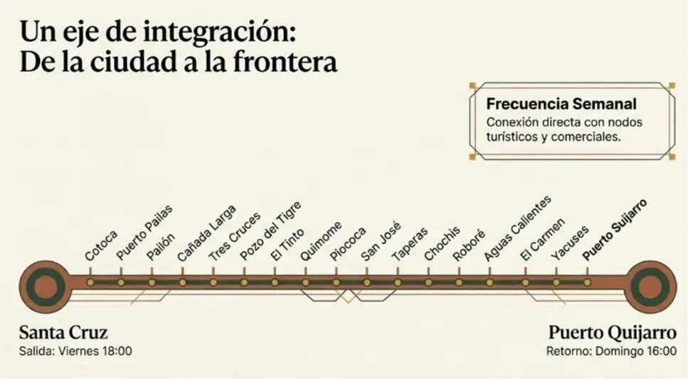 De acuerdo con información de FO, el ferrobús cuenta con capacidad para 42 pasajeros y operará inicialmente con frecuencia semanal. El servicio partirá de Santa Cruz los viernes a las 18:00 y retornará desde Puerto Quijarro los domingos a las 16:00.