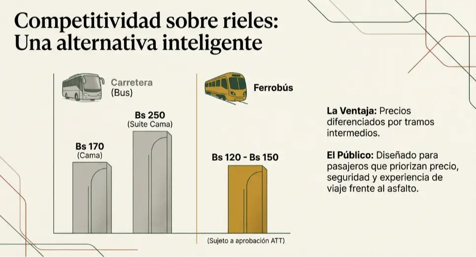 La reactivación del ferrobús también surge como una alternativa frente al transporte por carretera. Actualmente, el viaje en bus desde Santa Cruz hasta Puerto Quijarro tiene un costo que va desde Bs 170 en bus cama hasta Bs 250 en servicio suite cama. El ferrobús ingresará al mercado con una tarifa menor, buscando captar a pasajeros que priorizan precio, seguridad y experiencia de viaje.