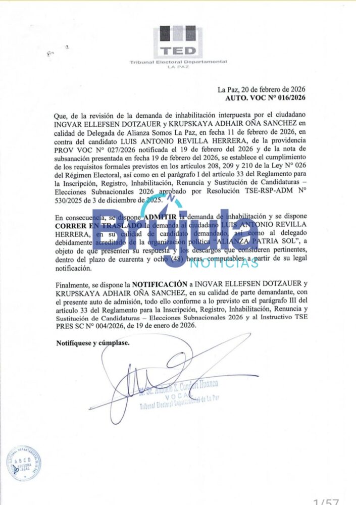El Tribunal Electoral Departamental de La Paz admitió la demanda para inhabilitar al candidato Luis Revilla, presentada por la alianza Somos La Paz, por la falta de residencia durante los dos años previos a la elección.
