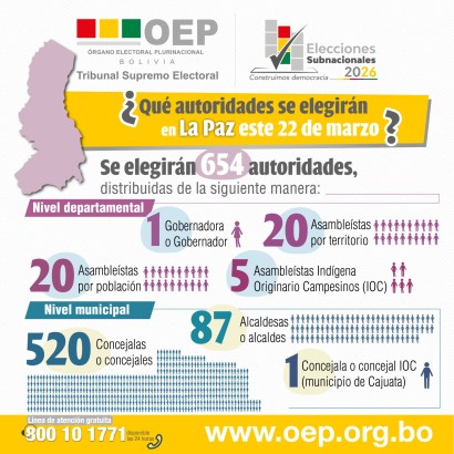 Durante las Elecciones Subnacionales 2026, más de 2.023.882 ciudadanas y ciudadanos ejercerán su derecho al voto en las 20 provincias de La Paz y elegirán a 654 autoridades departamentales y municipales.