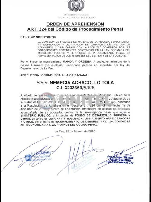 La Fiscalía confirmó este jueves que se emitió una orden de aprehensión contra Nemesia Achacollo, exministra de Desarrollo Rural y Tierras