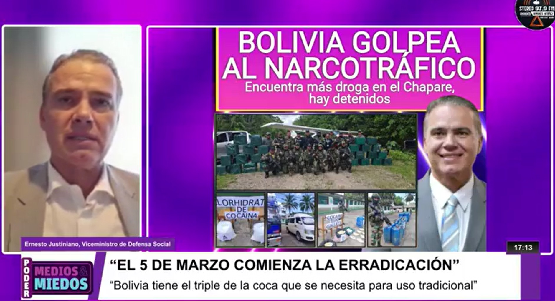 El 5 de marzo comenzarán oficialmente las labores de erradicación de cultivos ilegales de coca en Bolivia, confirmó al programa Poder, Medios y Miedos, el viceministro de Defensa Social y Sustancias Controladas, Ernesto Justiniano Urenda, quien advirtió además que el país enfrenta un exceso crítico de cultivos de hoja de coca y un alto potencial de producción de cocaína, lo que obliga a reforzar las acciones estructurales contra el narcotráfico.