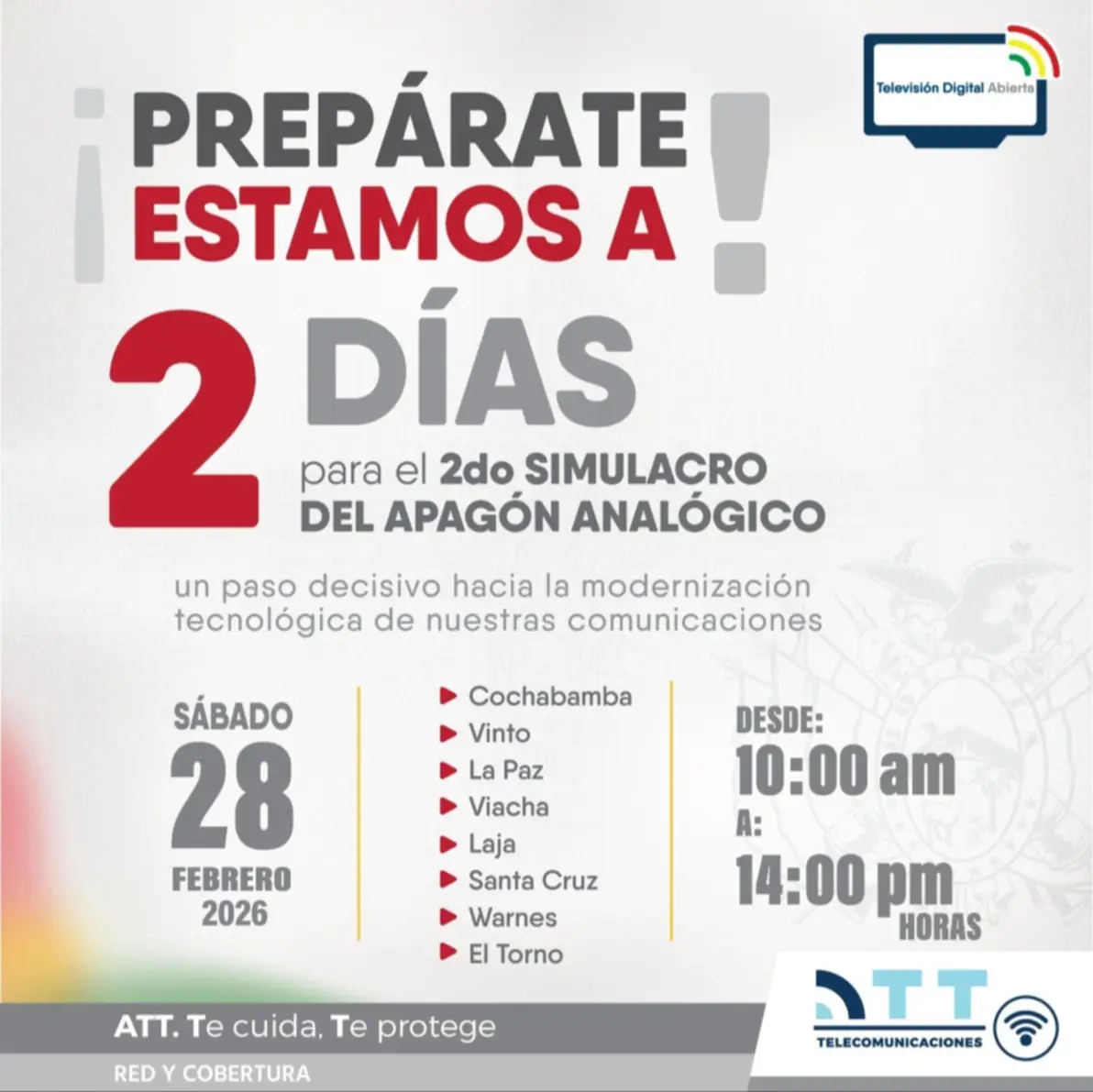La cuenta regresiva hacia el apagón analógico ya comenzó. Este sábado 28 de febrero se realizará un simulacro en las ciudades de La Paz, Cochabamba y Santa Cruz, como parte de la transición a la televisión digital terrestre.