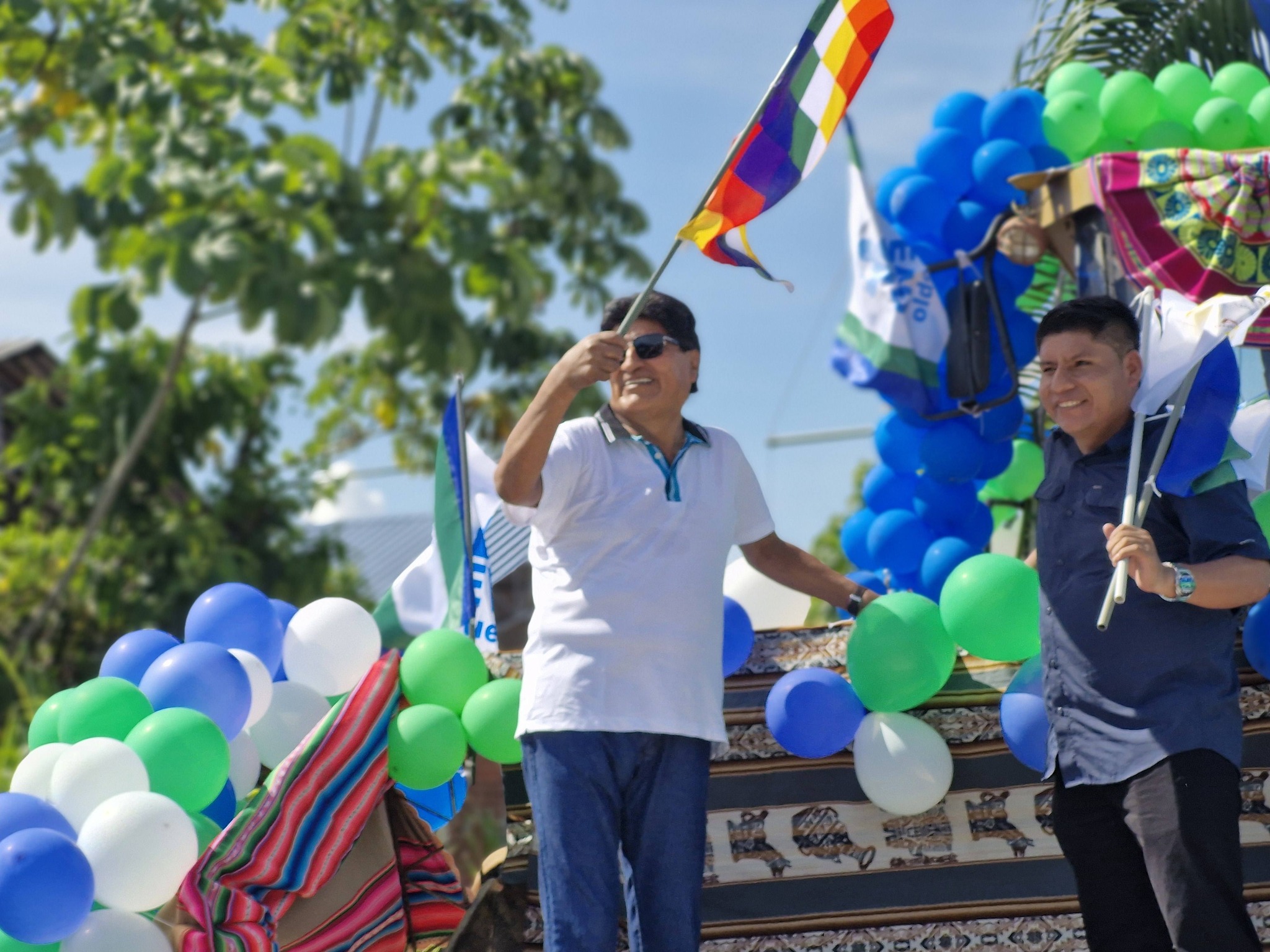 No obstante, en esta jornada Morales apareció sobre la hoja topadora de un tractor, sosteniendo una wiphala junto a Loza, candidato a la Gobernación de Cochabamba por la Alianza Unidos por los Pueblos (A-UPP).
