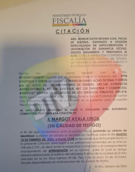 La Fiscalía Especializada en Anticorrupción de El Alto citó a declarar en calidad de testigo a Margot Ayala Lino, directora de la Agencia Nacional de Hidrocarburos (ANH), dentro del proceso penal que investiga por la presunta distribución de gasolina contaminada con agua, un hecho que habría puesto en riesgo la calidad del combustible y la seguridad del suministro. La cita fue programada para el martes 10 de febrero de 2026, a las 15:00 horas, en dependencias del Ministerio Público de El Alto, ubicadas en la avenida Raúl Salmón, según establece la citación fiscal.