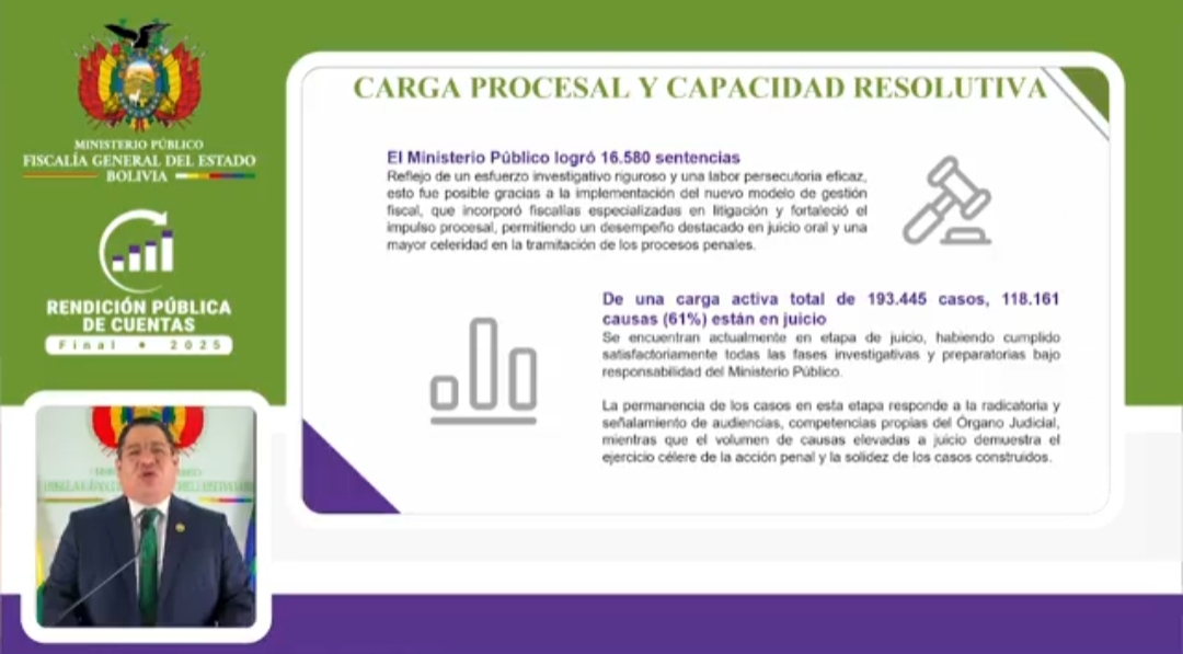 “El Ministerio Público enfrenta a una carga activa de 193.445 casos penales, que se encuentran en distintas etapas procesales a nivel nacional. Esta cifra refleja no sólo la magnitud del trabajo fiscal, sino también la complejidad de los fenómenos delictivos que afectan a la sociedad boliviana”, informó en la Rendición Publica de Cuentas Final 2025.