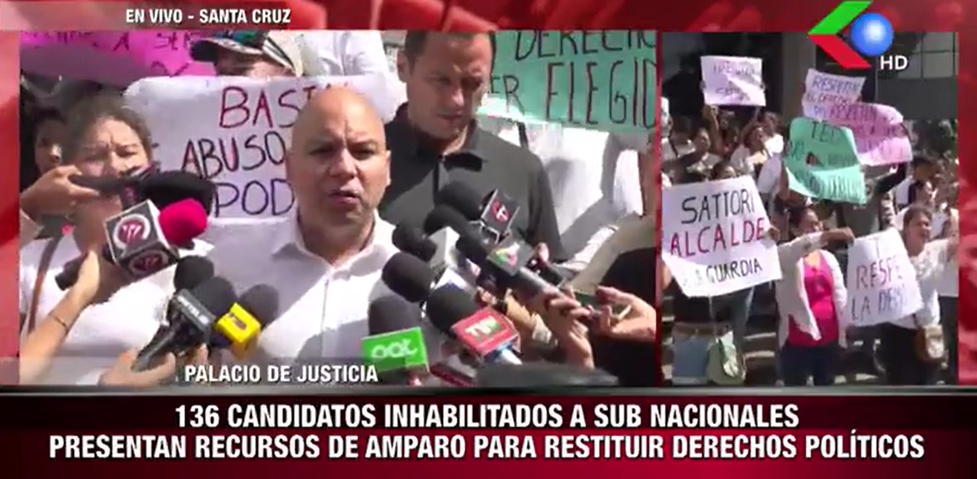 Un grupo de candidatos inhabilitados por el Tribunal Electoral Departamental (TED) de Santa Cruz presentó una acción de amparo constitucional con el objetivo de revertir la resolución que los dejó fuera de las elecciones subnacionales y exigir al Tribunal Supremo Electoral (TSE) la restitución de los derechos políticos de al menos 136 ciudadanos, porque vulnera principios constitucionales como el derecho a elegir y ser elegido.