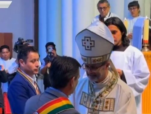 El obispo de Oruro, monseñor Cristóbal Bialasik, ofició la misa, en la que llamó al frente al Jefe de Estado, a quien secundó Lara.