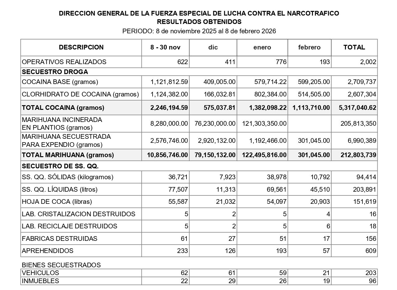Según el informe oficial de la Dirección General de la Fuerza Especial de Lucha Contra el Narcotráfico (FELCN), entre el 8 de noviembre de 2025 y el 8 de febrero de 2026 se ejecutaron 2.002 operativos, que derivaron en la incautación de más de 5,3 toneladas de cocaína, entre pasta base y clorhidrato, cantidad que refleja una evolución cuantitativa respecto al mismo período del año pasado.