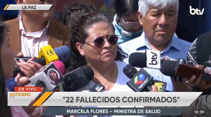La ministra de salud, Marcela Flores Zambrana, la mañana de este sabado, informó que ya son 22 los fallecidos del accidente áereo. Pide a la población donar sangre para asistir a los heridos.