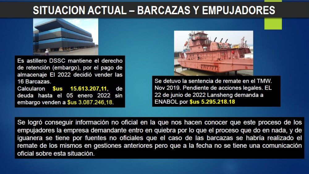 En el caso de los remolcadores, ese año el Tribunal Marítimo de Nanjing comunicó a Enabol que aceptó la demanda que interpuso la empresa Nanjing Lansheng Shipbuilding CO. LTDA contra la empresa estatal por una deuda de 5,2 millones de dólares, pero el proceso no avanzó porque aparentemente la firma demandante quebró.
