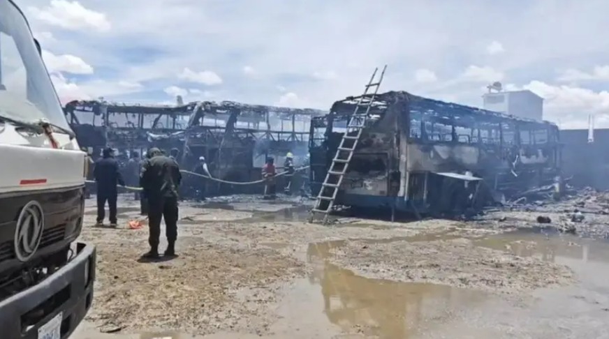 Un incendio registrado este jueves en un taller mecánico de la zona este de Oruro dejó un saldo devastador: al menos cinco buses de transporte interdepartamental fueron consumidos por las llamas.