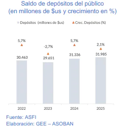 Detalla que, a diciembre de 2025, el saldo de los depósitos del público alcanzó a $us 31.985 millones. Y remarca que en 2025 hubo mayores presiones inflacionarias e incremento sostenido del precio del dólar en el mercado paralelo.