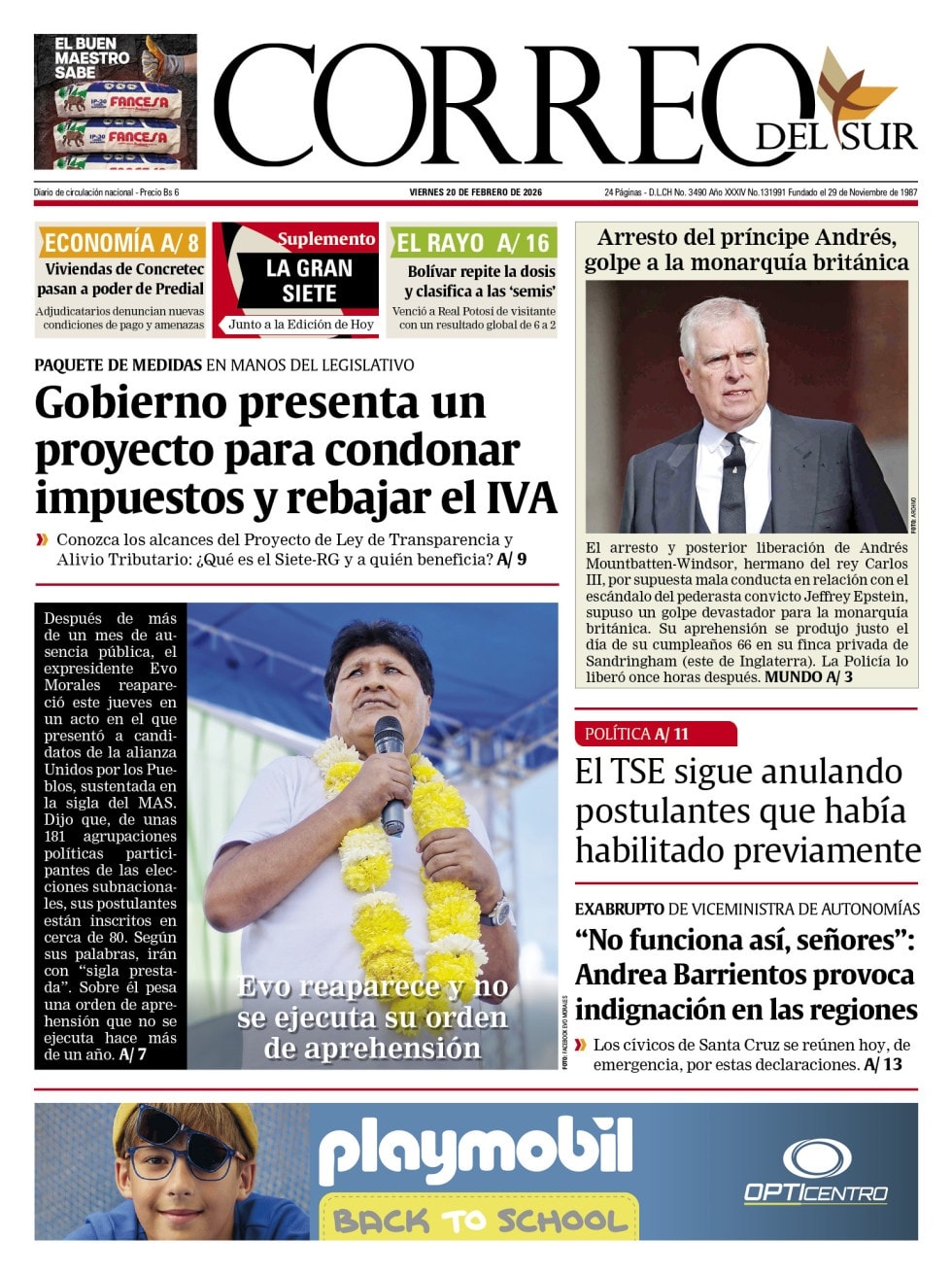 Portadas de los periódicos de Bolivia del viernes 20 de febrero del 2026