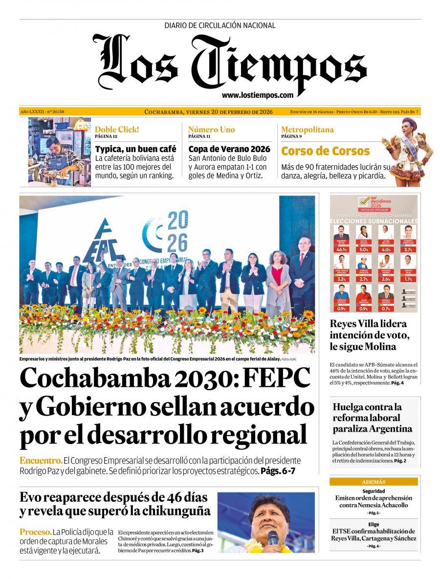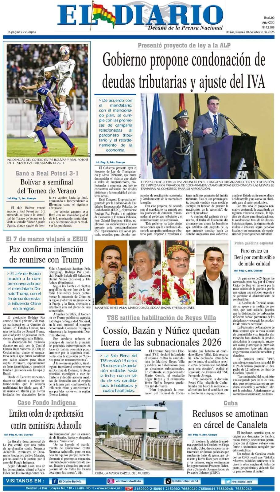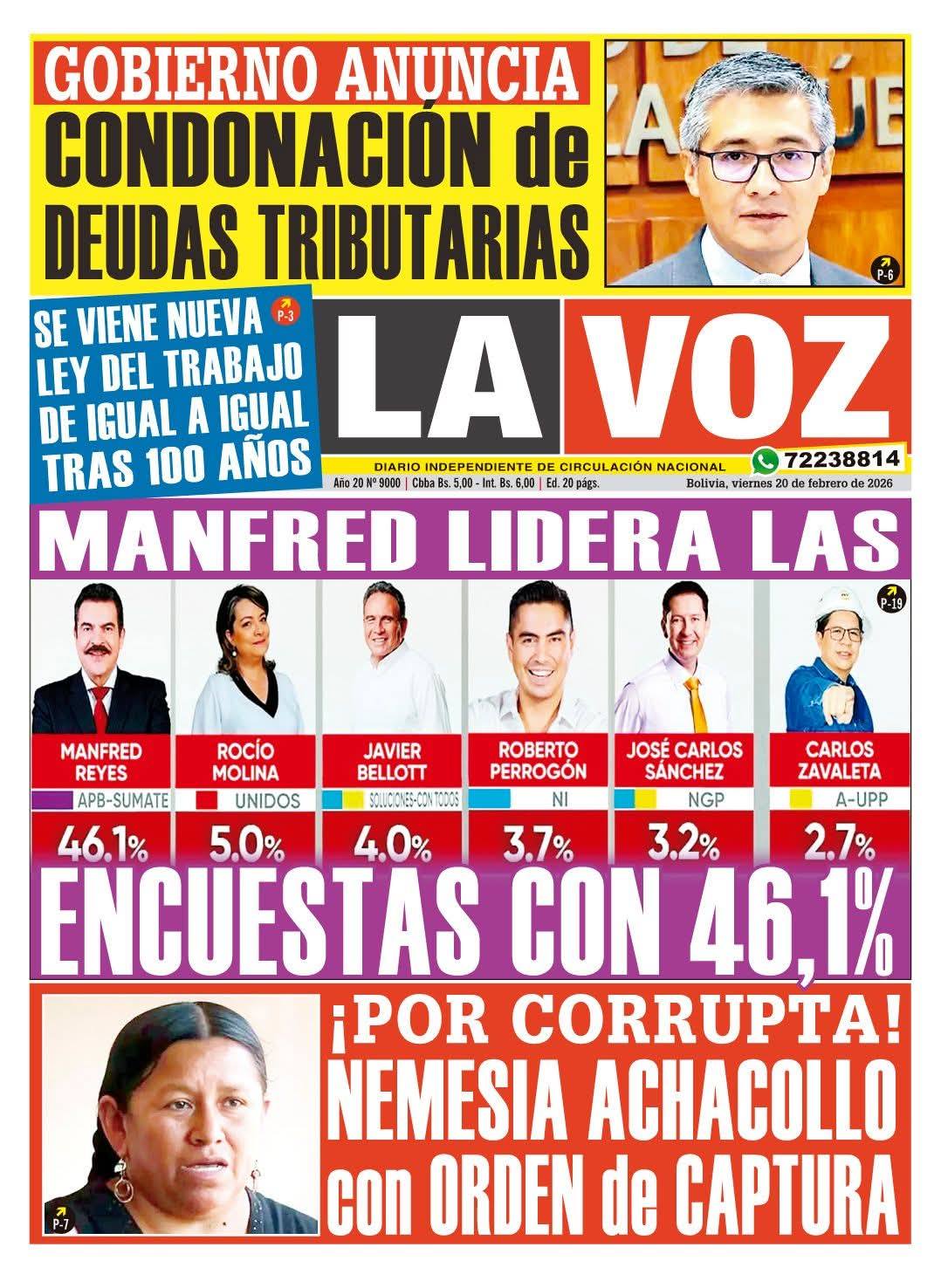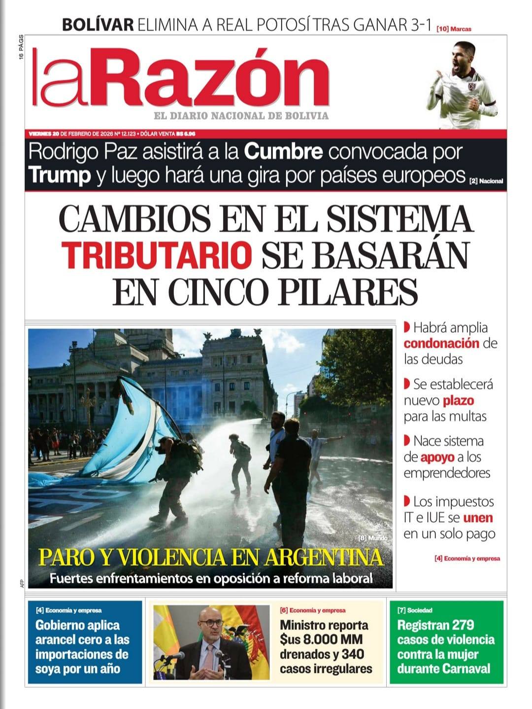 Portadas de los periódicos de Bolivia del viernes 20 de febrero del 2026