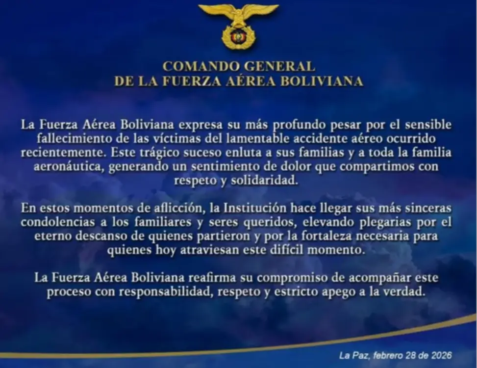 En un pronunciamiento público, el Comando General de la Fuerza Aérea Boliviana expresó su “más profundo pesar por el sensible fallecimiento de las víctimas del lamentable accidente aéreo ocurrido recientemente”.