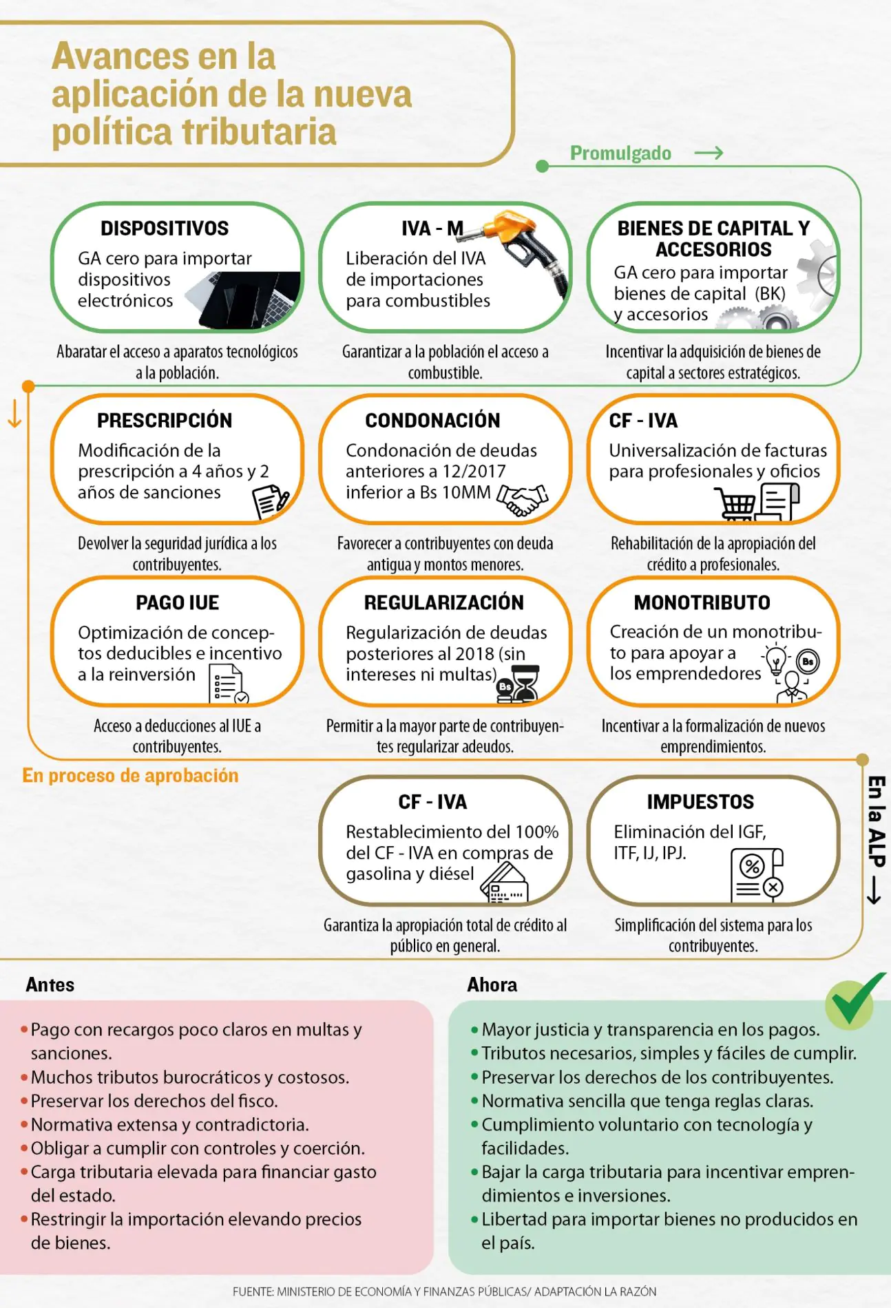 “Está la universalidad de facturas, la compensación del IUE (Impuestos a las Utilidades de las Empresas) con el IT (Impuestos a las Transacciones), algunos ajustes en el impuesto a los consumos específicos que ha tenido un incremento desproporcional por la elevación de la UFV ”, explicó.