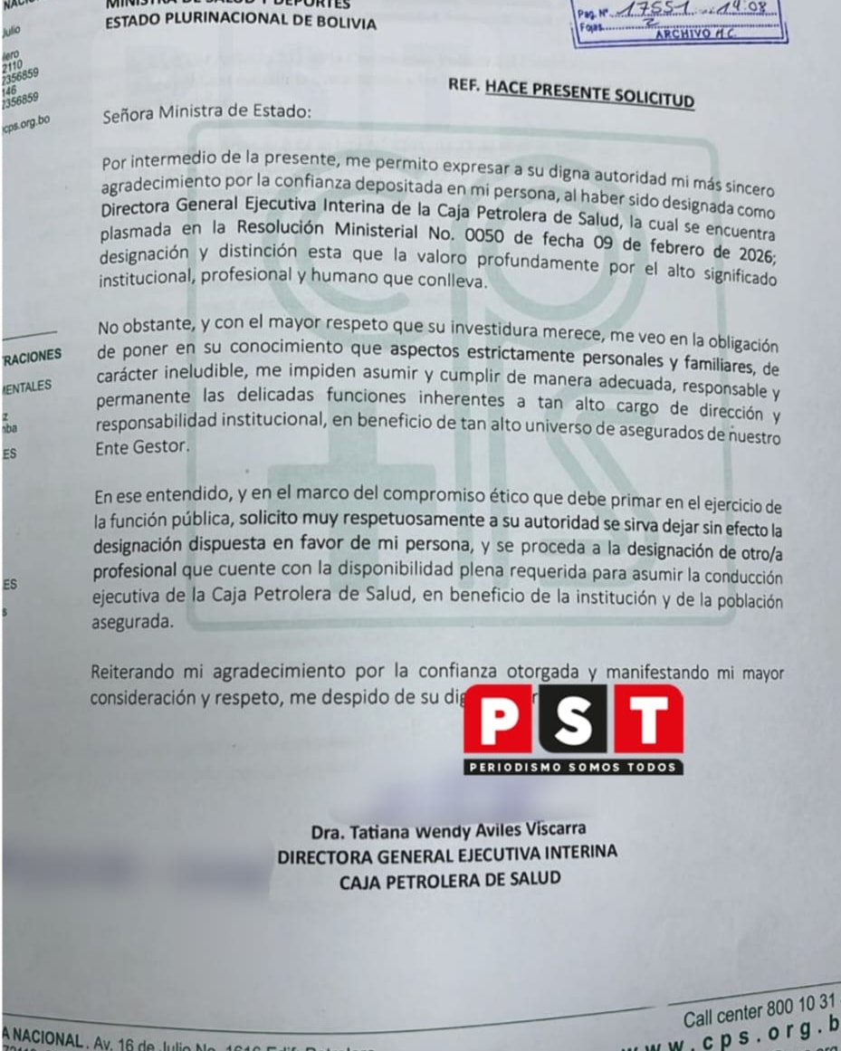 La misiva de la doctora Tatiana Avilés Viscarra. Foto: PST