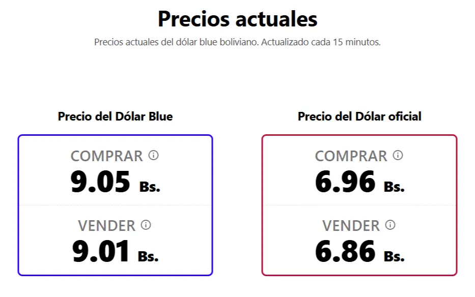 Por su parte, bolivianblue.net, que actualiza sus cifras cada 15 minutos, reporta este jueves Bs 9,05 para la compra y Bs 9,01 para la venta. La noche previa había cerrado en Bs 9,04 para la compra y Bs 9,01 para la venta.