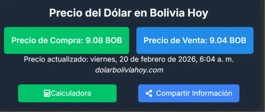 De acuerdo con el portal dolarboliviahoy.com, la divisa estadounidense se cotiza en Bs 9,08 para la compra y Bs 9,04 para la venta, lo que representa un ajuste mínimo frente a la jornada previa.