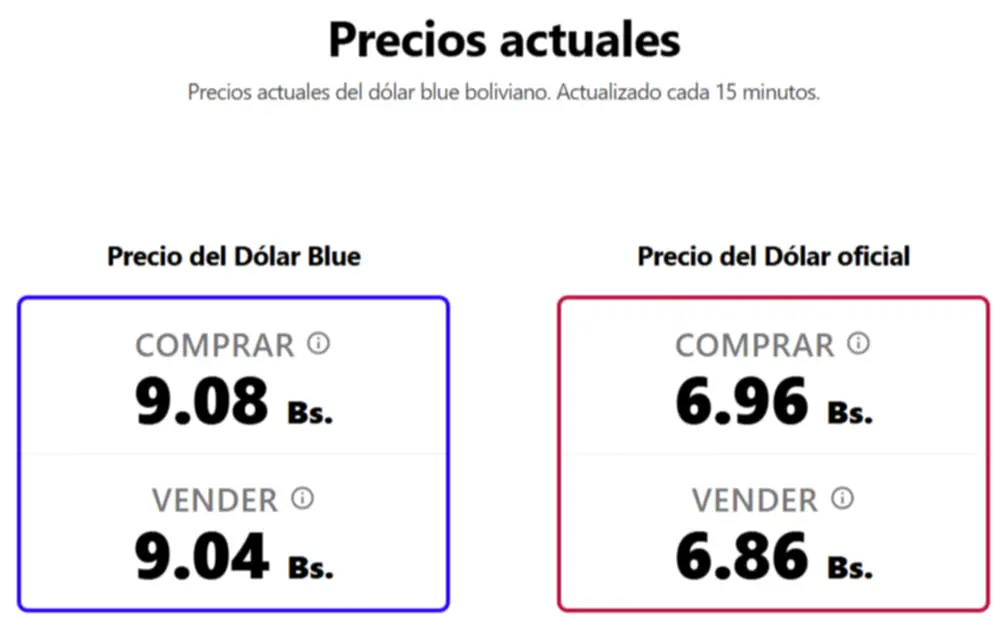 Por su parte, bolivianblue.net, que actualiza sus cifras cada 15 minutos, muestra un comportamiento similar: Bs 9,08 para la compra y Bs 9,04 para la venta. La noche anterior cerró en Bs 9,08 para la compra y Bs 9,06 para la venta.
