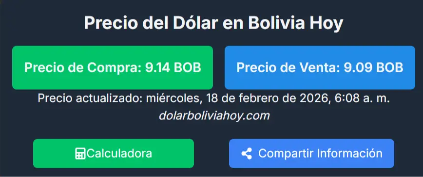 De acuerdo con dolarboliviahoy.com, la divisa estadounidense se cotiza en Bs 9,14 para la compra y Bs 9,09 para la venta. El martes por la noche, el mismo sitio reportaba Bs 9,14 para la compra y Bs 9,10 para la venta.