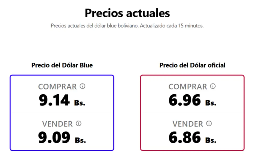 Por su parte, bolivianblue.net, que actualiza sus cifras cada 15 minutos, muestra valores similares: Bs 9,14 para la compra y Bs 9,09 para la venta. La jornada previa había concluido con Bs 9,14 y Bs 9,10, respectivamente.