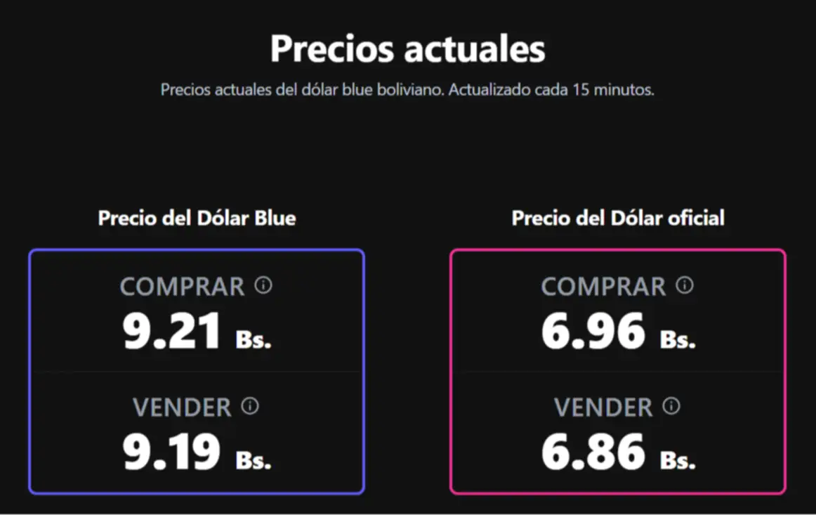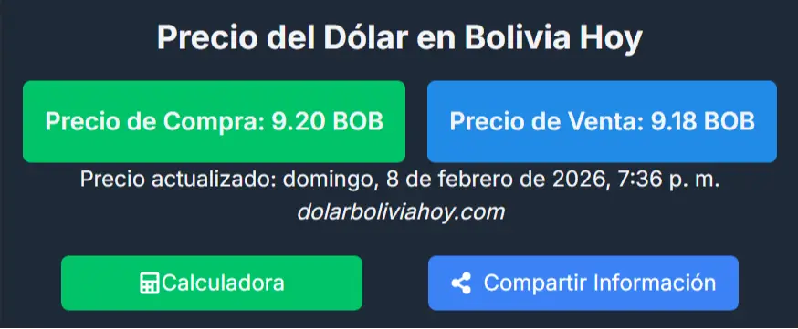 Por su parte, el sitio de monitoreo en tiempo real bolivianblue.net, que actualiza sus cifras cada 15 minutos en base a operaciones de calle, reportó un cierre similar, con el dólar paralelo en Bs 9,21 para la compra y Bs 9,19 para la venta.