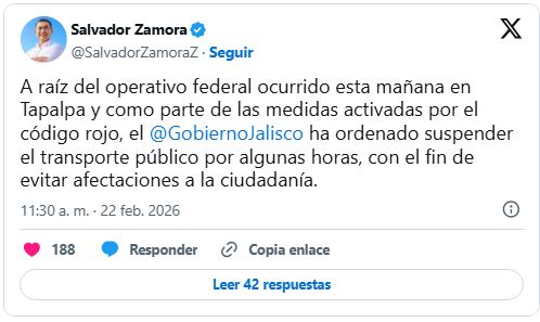 «Fuerzas federales realizaron hace unas horas un operativo en Tapalpa que ha derivado en enfrentamientos en la zona. También a raíz de dicho operativo, en distintos puntos de esa región y en otros puntos de Jalisco individuos han quemado y atravesado vehículos para inhibir la acción de las autoridades», comunicó el gobernador estatal, Pablo Lemus Navarro.