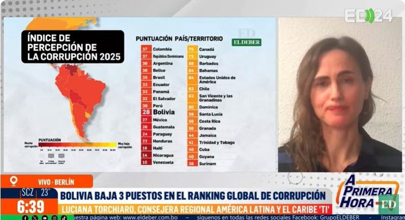 La consejera regional para América Latina y el Caribe de Transparencia International, Luciana Torchiaro, afirmó este jueves que Bolivia “presenta problemas de corrupción muy estructurales y muy arraigados”, después de que este país obtuviera sólo 28 puntos sobre 100 en el ranking mundial de la corrupción.