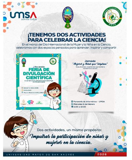 Una feria científica abierta al público y una jornada de diálogo entre niñas, jóvenes y científicas destacadas forman parte de la actividades que la Organización para las Mujeres en la Ciencia para el Mundo en Desarrollo (OWSD), con apoyo de la Universidad Mayor de San Andrés, desarrollará en La Paz por el Día Internacional de la Mujer y la Niña en la Ciencia, con el fin de promover referentes femeninos y despertar vocaciones en las nuevas generaciones.