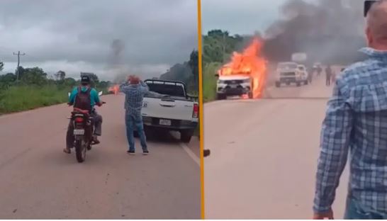 Santa Cruz. En videos grabados por personas que se encontraban en el lugar se observa a la camioneta completamente envuelta en llamas, mientras que a pocos metros otros vehículos permanecen detenidos y sus ocupantes observan con asombro la escena.