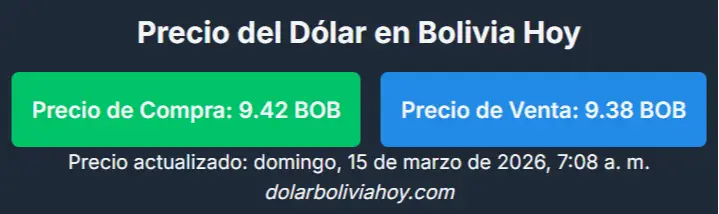 Sin embargo, de acuerdo con el portal dolarboliviahoy.com, la divisa estadounidense se cotiza hoy en Bs. 9.42 para la compra y Bs. 9.38 para la venta. Estas cifras representan un incremento significativo respecto al día de ayer, cuando el sitio reportaba la compra en Bs. 9.31 y la venta en Bs. 9.27.