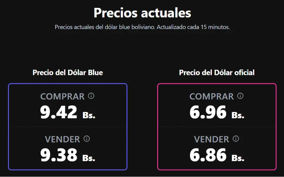 Por su parte, el sitio especializado bolivianblue.net mantiene sus indicadores alineados con la tendencia máxima del mercado. En esta plataforma, el precio se sitúa este domingo en Bs. 9.42 para la compra y Bs. 9.38 para la venta.
