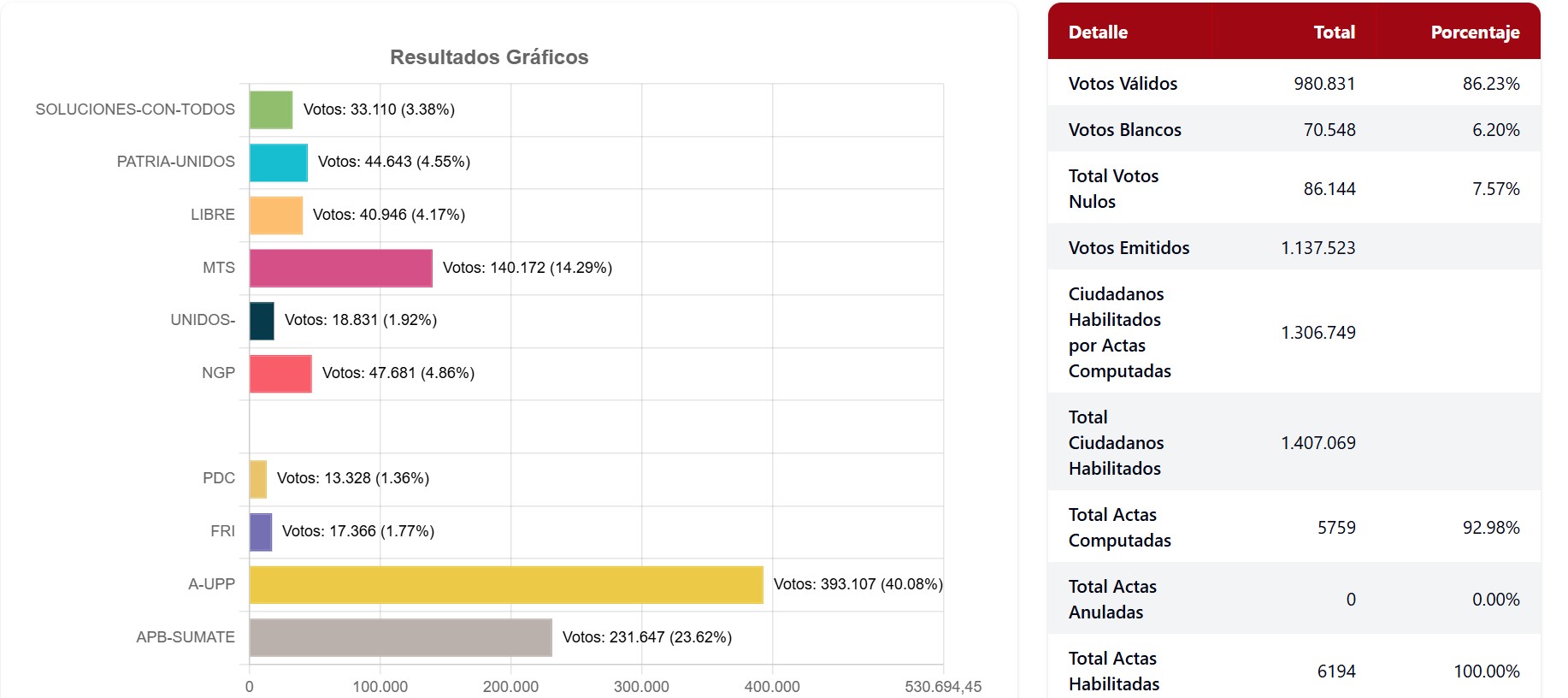 El cómputo oficial de las elecciones subnacionales ingresó a su recta final con solo dos departamentos aún pendientes de completar el procesamiento total de actas: Cochabamba y Santa Cruz. Según el reporte, el resto del país ya alcanzó el 100% del conteo, consolidando los resultados en la mayoría de las regiones. En Cochabamba, el proceso mantiene expectativa debido a la definición de resultados en disputa, mientras que en Santa Cruz continúa el ingreso de actas para completar el cómputo departamental. Las autoridades electorales señalaron que el trabajo se desarrolla bajo supervisión y conforme a los procedimientos establecidos, con presencia de delegados de organizaciones políticas. Se prevé que en las próximas horas se cierre el conteo nacional, lo que permitirá oficializar los resultados finales de los comicios en todo el país.
