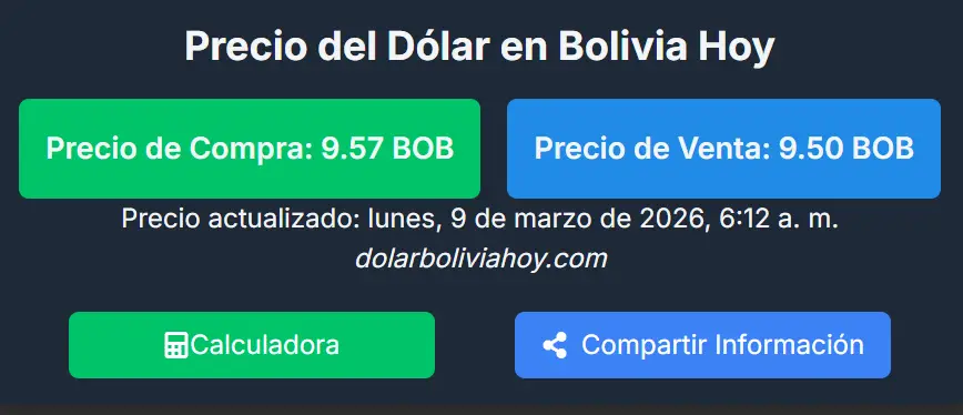 De acuerdo con el portal dolarboliviahoy.com, la divisa estadounidense se cotiza en Bs 9,57 para la compra y Bs 9,50 para la venta, lo que refleja un ajuste al alza frente a los valores reportados el domingo.