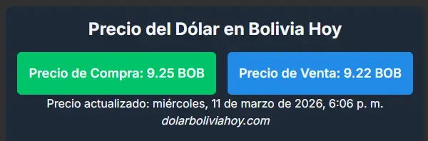 De acuerdo con el portal especializado dolarboliviahoy.com, la divisa estadounidense comenzó el día con fuerza, cotizando a Bs 9,31 para la compra a las 6:00 a.m. Sin embargo, al cerrar la tarde, el valor se ajustó a Bs 9,25 para la compra y Bs 9,22 para la venta.