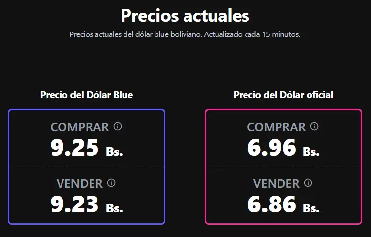 - Al mediodía: Alcanzó su punto más bajo, llegando a los Bs 9,21 para la compra y Bs 9,20 para la venta.