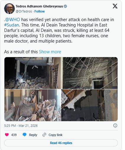 «LaOMS ha verificado otro ataque más contra la atención sanitaria en Sudán. Esta vez, el Hospital de Enseñanza El-Daein en la capital de Darfur Este, El-Daein fue atacado, matando al menos a 64 personas, incluyendo 13 niños, dos enfermeras, un médico y múltiples pacientes», dijo en X el director de la OMS, Tedros Adhanom Ghebreyesus.