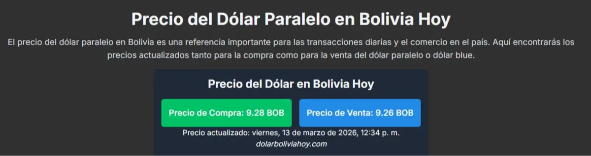 De acuerdo con datos del portal especializado dolarboliviahoy.com, a las 12:34 la moneda norteamericana se cotizaba en Bs 9,26 para la venta y Bs 9,28 para la compra. En comparación con la mañana, cuando alcanzó Bs 9,25 para la venta y Bs 9,32 para la compra, se observa un leve ajuste en los valores.