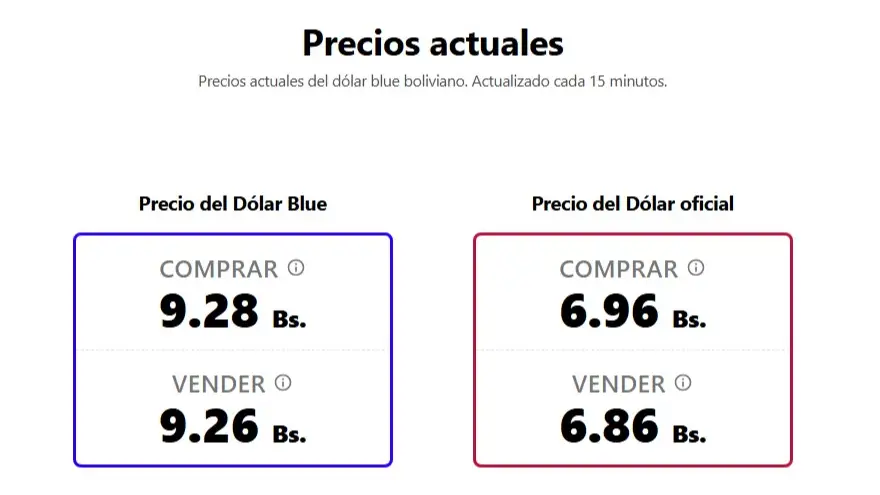 Por su parte, el denominado dólar blue, reportado por bolivianblue.net, también mostró pequeños movimientos dentro del mercado informal, situándose en Bs 9,26 para la venta y Bs 9,28 para la compra. Aunque las cifras se mantienen dentro de un rango similar, se registran ligeras diferencias entre ambas plataformas de referencia.