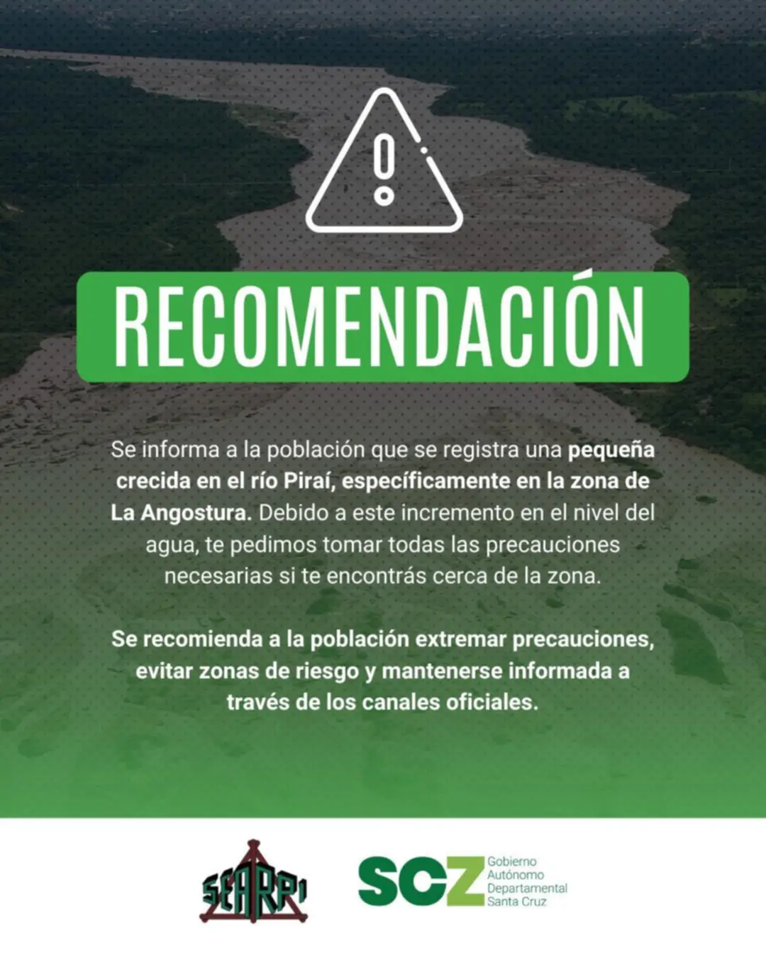 “Se informa a la población que se registra una pequeña crecida en el río Piraí, específicamente en la zona de La Angostura. Debido a este incremento en el nivel del agua, pedimos tomar todas las precauciones necesarias si se encuentran cerca de la zona”, señala la publicación oficial.