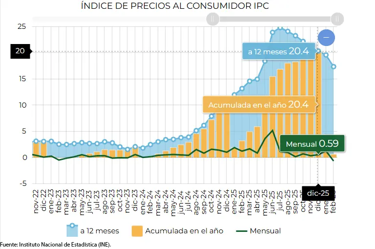 De acuerdo con información del Instituto Nacional de Estadística (INE), la inflación en enero de 2026 registró una cifra de 1,31%, mientras que en febrero bajó a -0,62%.