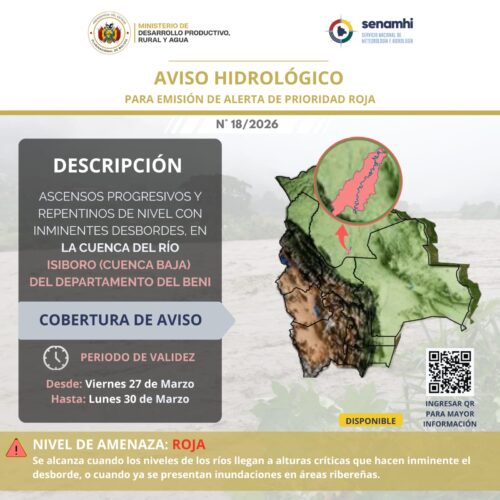 El Servicio Nacional de Meteorología e Hidrología (Senamhi) emitió este sábado el Aviso Hidrológico 18/2026 con prioridad roja, alertando sobre un riesgo inminente de desbordes e inundaciones en la cuenca baja del río Isiboro, en el departamento del Beni, según un comunicado.