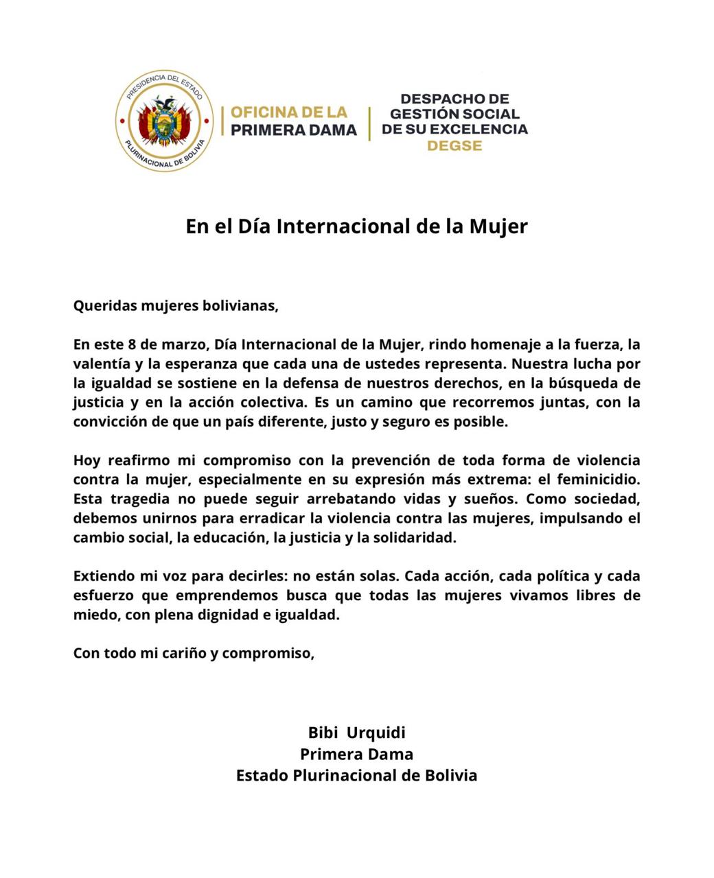 En el marco del Día Internacional de la Mujer, Bibi Urquidi dirigió un mensaje a todas las mujeres bolivianas, resaltando su compromiso con la igualdad de oportunidades y el desarrollo económico de las mujeres en el país.