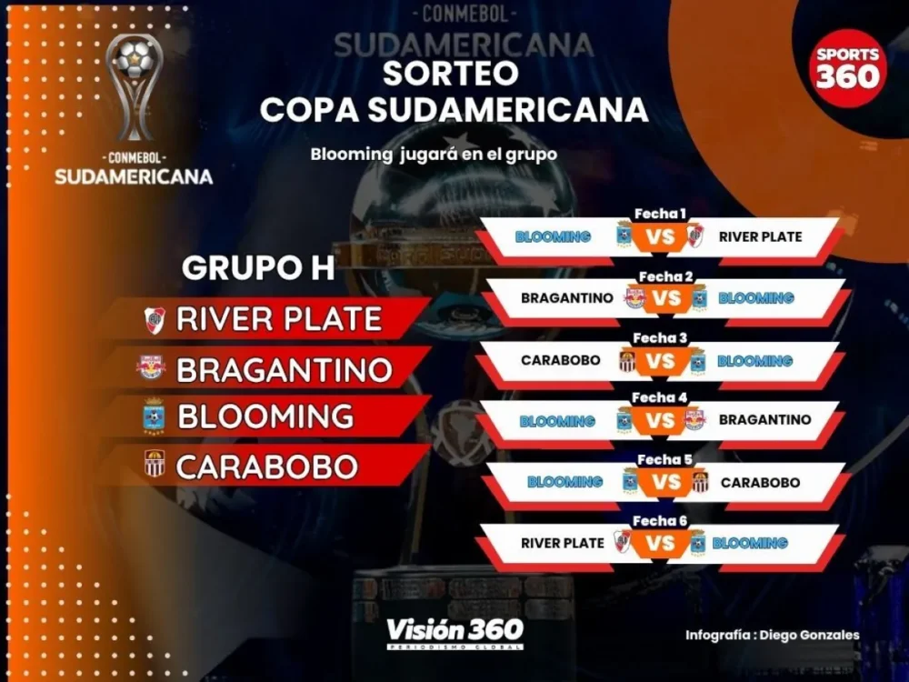 Blooming quedó emparejado en el Grupo H de la Copa Sudamericana y enfrentará al argentino River Plate, al brasileño Bragantino y al venezolano Carabobo, rivales a los que enfrentará por primera vez en su historia, según determinó el sorteo que se realizó la Conmebol este jueves por la noche en Luque, Paraguay. Además, Independiente fue situado en el E con el argentino Racing, el venezolano Caracas y el brasileño Botafogo.