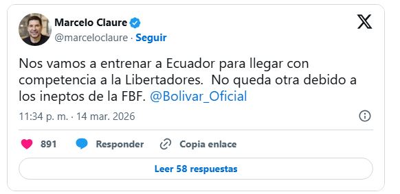 “Nos vamos a entrenar a Ecuador para llegar con competencia a la Libertadores. No queda otra debido a los ineptos de la FBF. @Bolivar_Oficial”, escribió el dirigente académico en su cuenta personal. Hasta el momento, el club no ha detallado la fecha de viaje ni el tiempo que permanecerá el equipo en territorio ecuatoriano para cumplir con esta etapa de preparación.